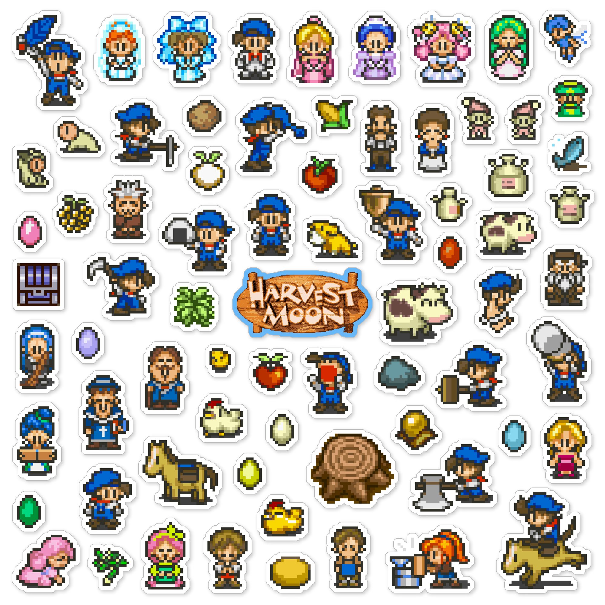 Made to order 73-piece Harvest Moon vinyl sticker set features characters and items from the 1997 Super Nintendo SNES game.
