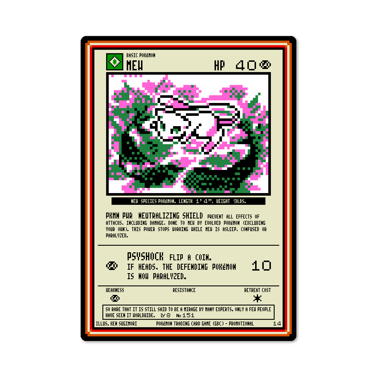 Mew #14 custom card from the Promotional Series, designed in the style of the original Pokémon Trading Card Game. Features graphics from the 2000 Nintendo Game Boy Color game and is based on the in-game version of the official TCG card.