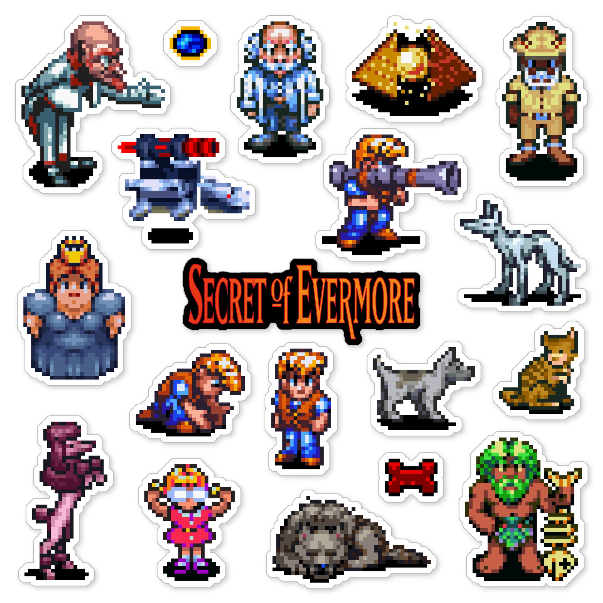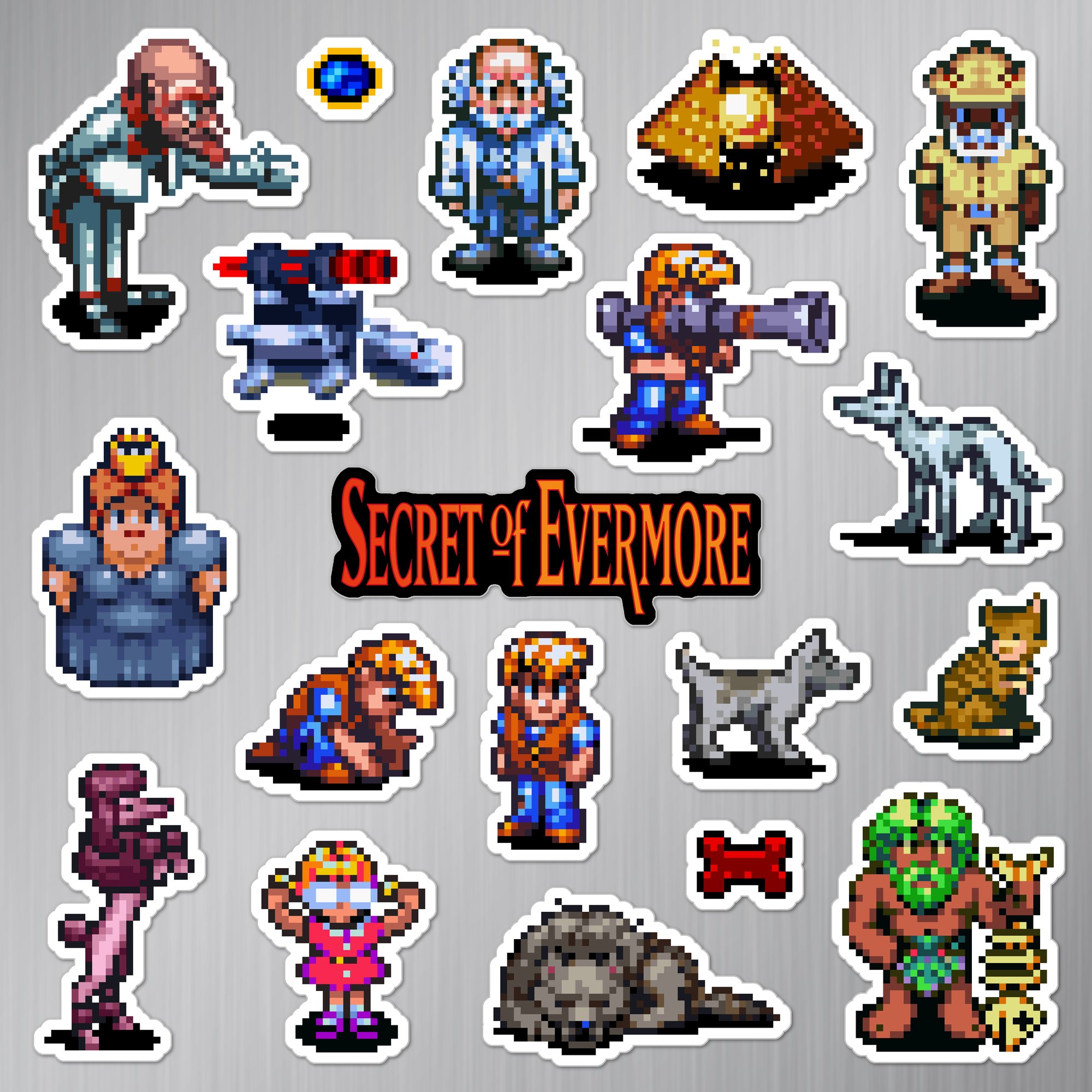 Made to order 19-piece Secret of Evermore set features characters and items from the 1995 Super Nintendo SNES game.
