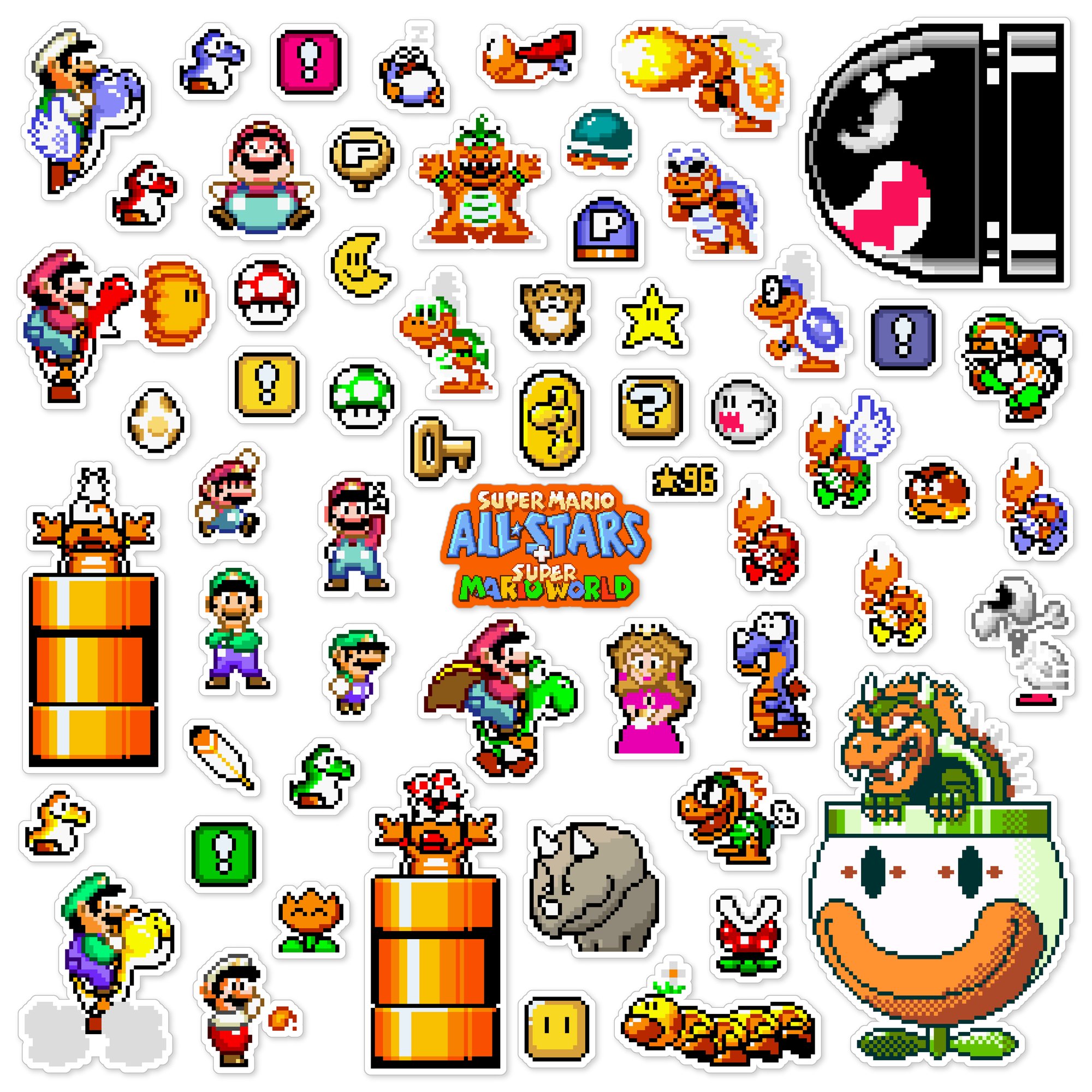Made to order 60-piece Super Mario World All-Stars vinyl sticker set features characters and items from the 1994 re-release of Super Mario World included in the Super Mario All-Stars + Super Mario World Super Nintendo SNES game.