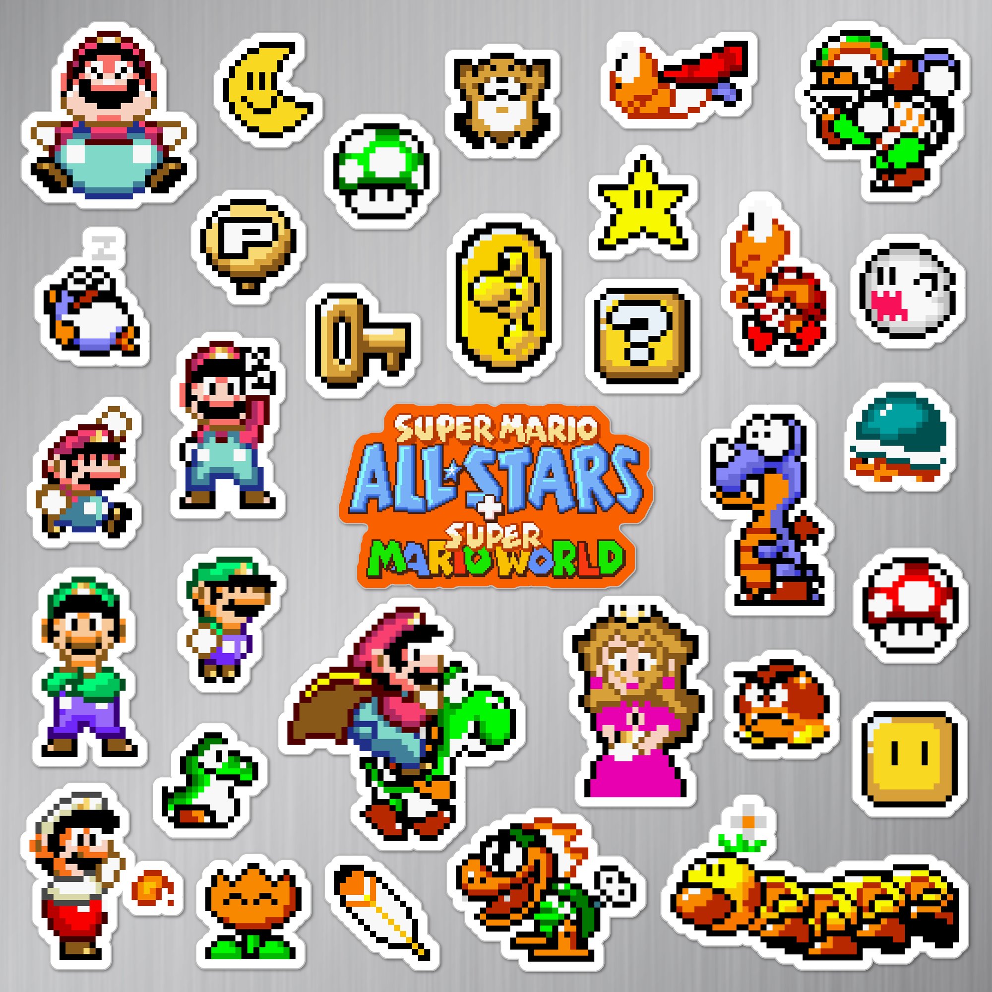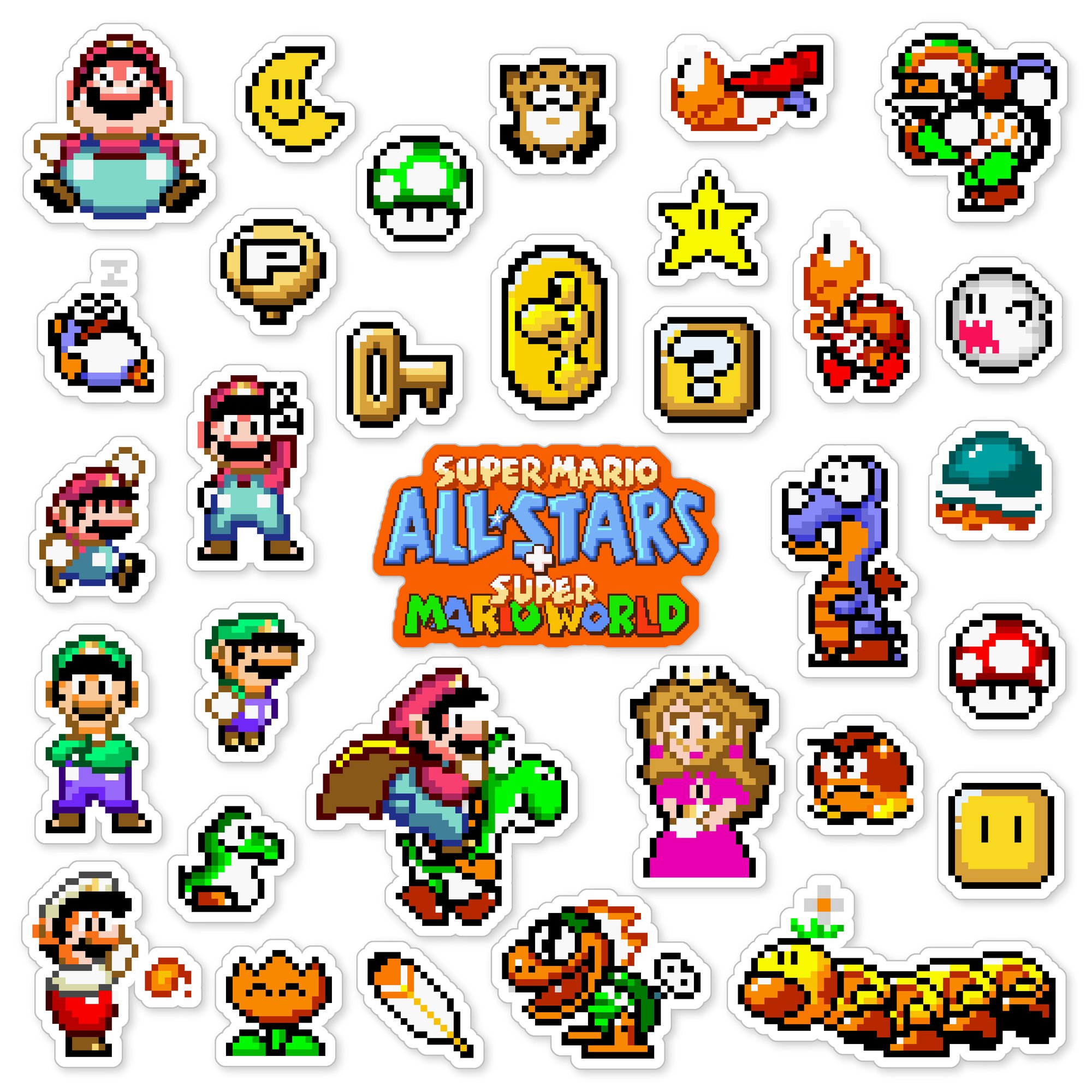 Made to order 32-piece Super Mario World All-Stars set features characters and items from the 1994 re-release of Super Mario World included in the Super Mario All-Stars + Super Mario World Super Nintendo SNES game.