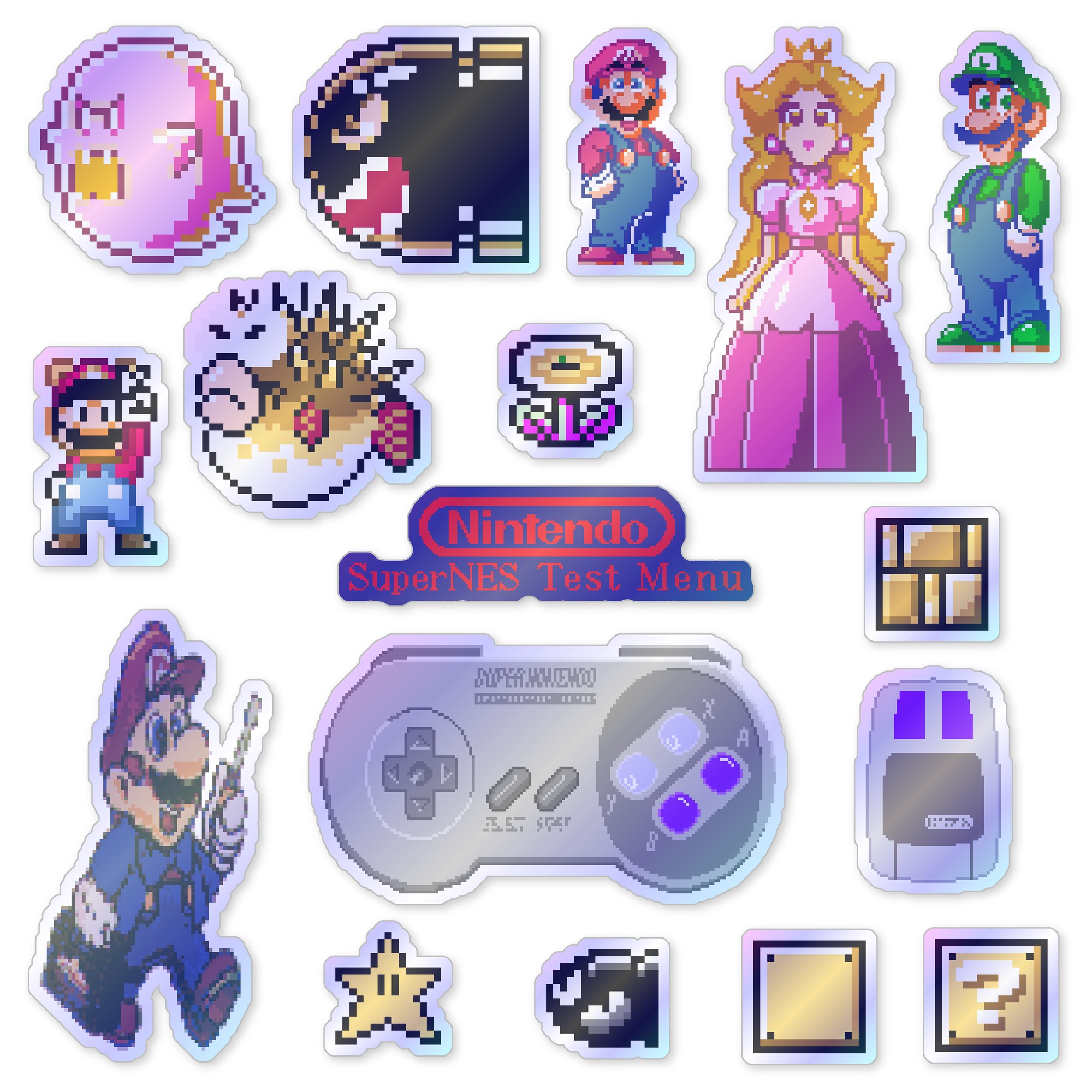 Made to order 17-piece SuperNES Test Program set features characters and items from the 1991 Super Nintendo SNES test cartridge.
