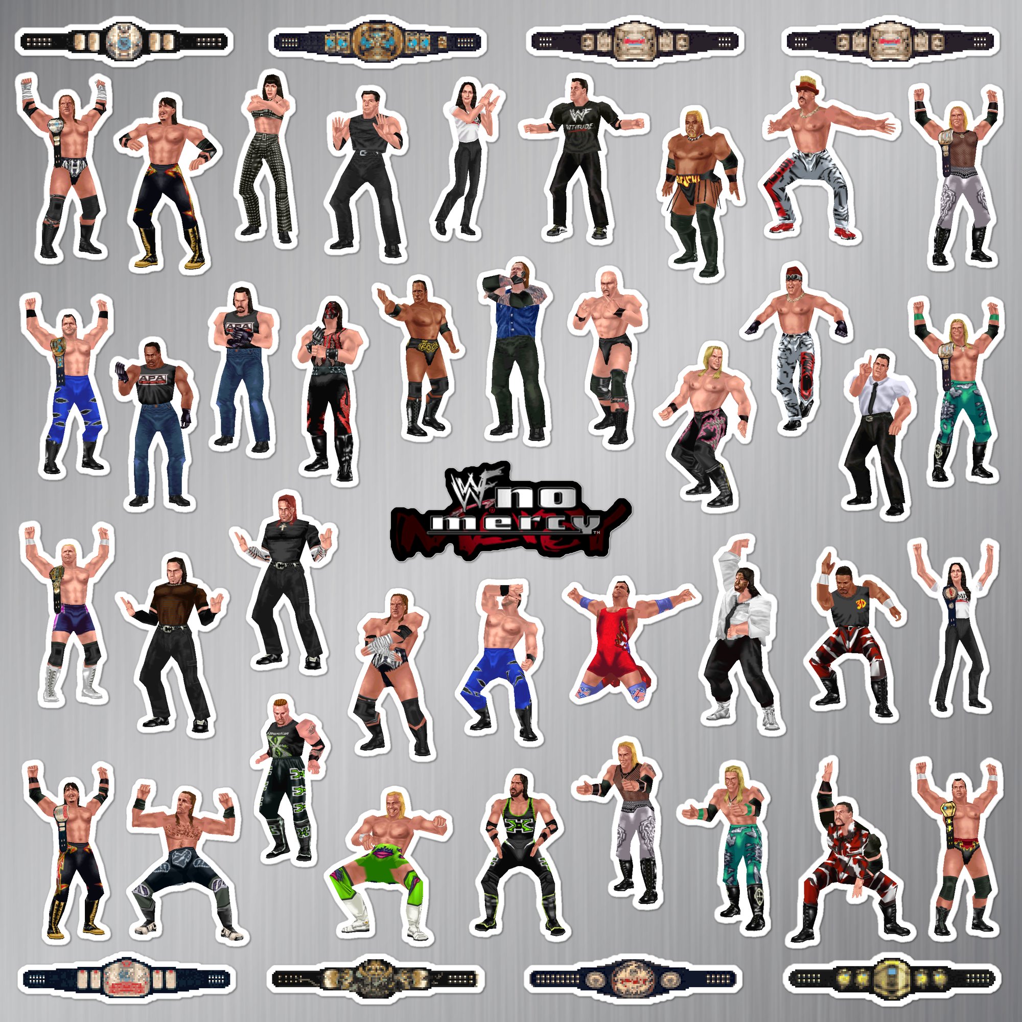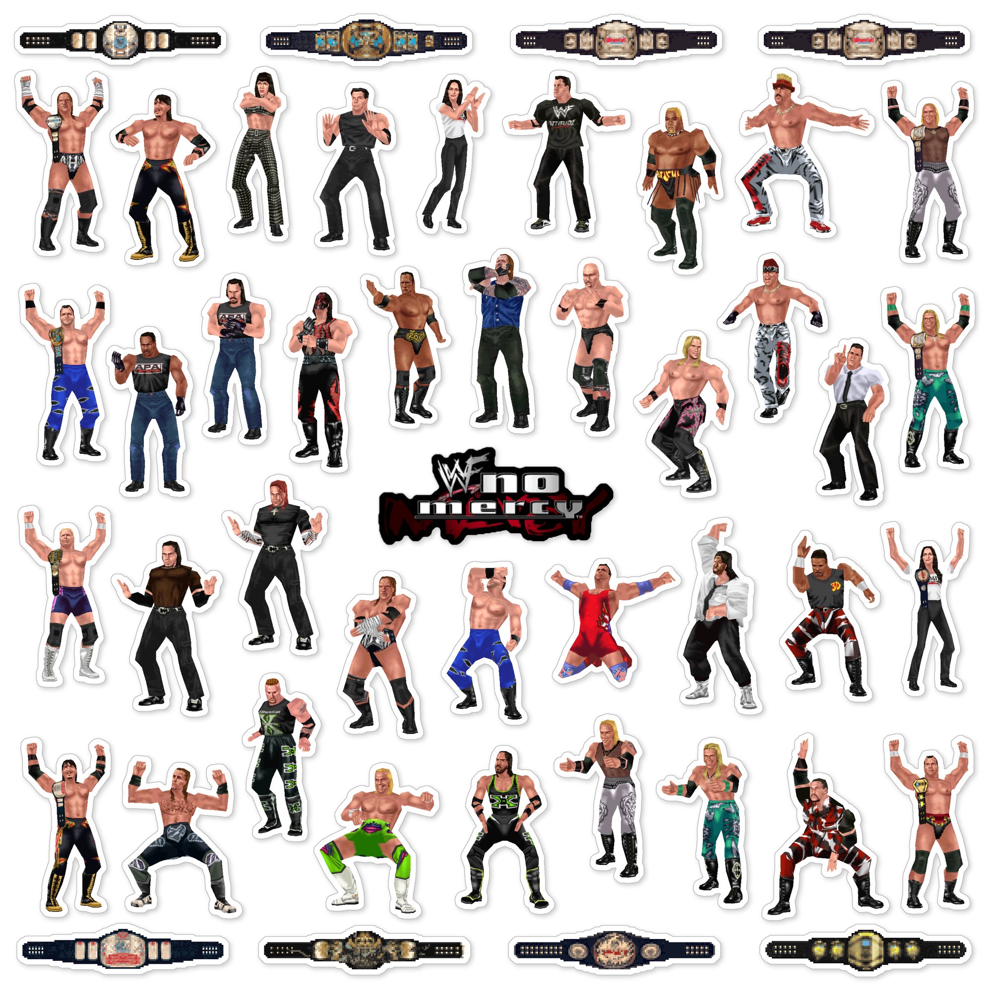 Made to order 47-piece WWF No Mercy set features wrestlers and championship belts from the 2000 Nintendo 64 N64 game.